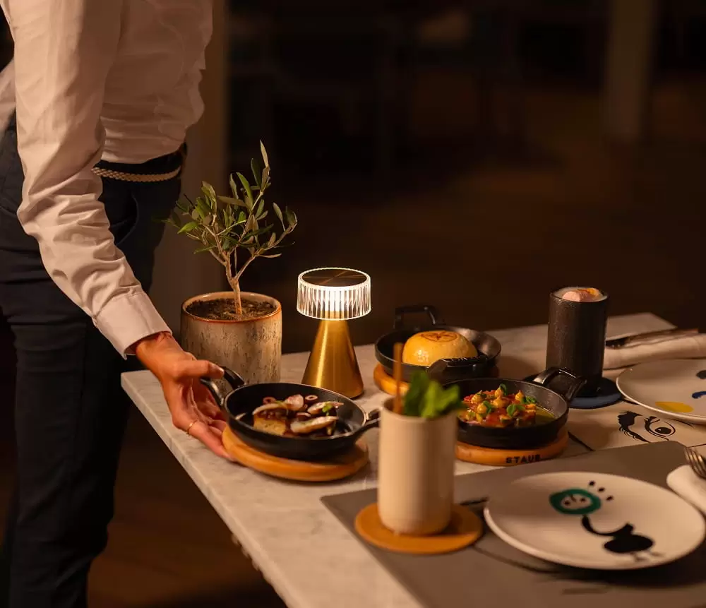 The culinary experience at the Seven Stars Bar is equally remarkable, with a tapas menu that pairs perfectly with our astrological cocktails. The tables themselves are works of art, designed to resemble real paintings, while the plates are from the exclusive A Toute Epreuve - Juan Miró collection by the esteemed French porcelain manufacturer, Bernardaud. Each element is chosen to enhance the aesthetic journey, ensuring that your dining experience is as visually stunning as it is delicious.